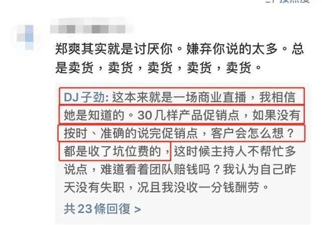参与直播的男主持人@DJ子劲 之后对此进行了回应,表示郑爽本人清楚,这是一次商业直播,因为她是收了商家坑位费的,有30多个促销点,应该准时、准确地说完每一件商品,否则很可能违约导致郑爽赔钱。