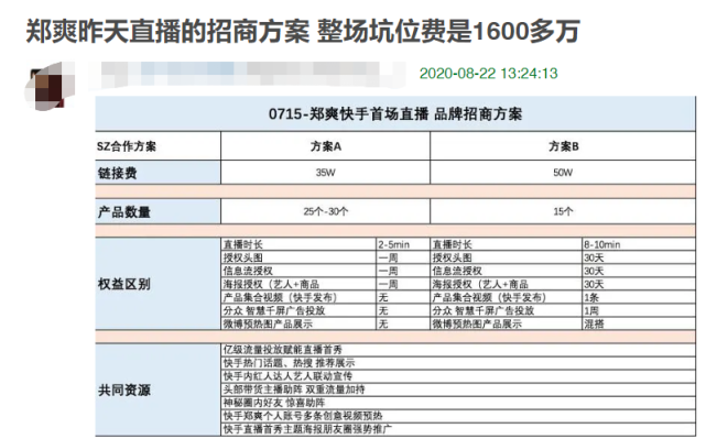 而文章开头提到的“郑爽直播坑位费”热搜,是此后有网友直接曝光了郑爽这次直播活动赚到的坑位费。35万坑位费的商品计划25到30个,50万坑位费商品计划15个,不同的钱自然有不同的权益,如介绍时间、授权内容、平台投放等等。如此看来,郑爽这次带货直播对商品的数量、时间都是进行严格规划过的。