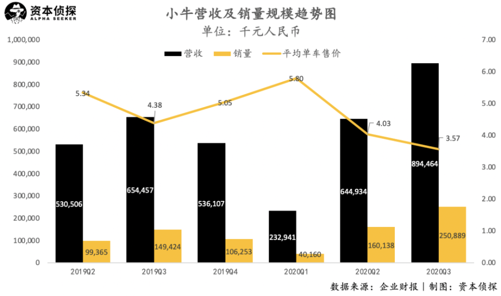 此外,影响营收增速的更核心原因在于,小牛平均单车售价一再降低,三季度已跌破四千元。通过高端市场建立品牌效应,再通过平价产品走量,是特斯拉、蔚来所采用的发展战略,但小牛对这一战略的具体实践并不理想,对低价车型的日益依赖,拖累了营收的增长速度,也一定程度上缩小了小牛与其他电动车品牌相比的差异性。