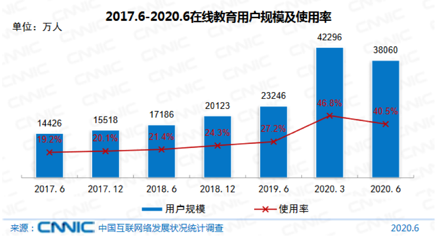 CNNIC数据显示,疫情期间的2020年3月,国内在线教育用户规模达到了4.2亿,占中国网民数量的比例达到46.8%。到疫情基本得到控制的6月,依然有3.8亿,占比40.5%,相比去年6月的27.2%,在线教育行业渗透率大幅提升。