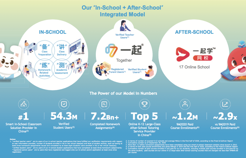 通过首次公开募股(IPO),一起教育科技共募集约3.3亿美元,承销商为摩根士丹利、高盛和美银和华兴资本。招股书显示,募资所得净额将主要用于课外在线教育服务的改善、智能课堂教育解决方案的产品增强、技术研发能力的提升、销售及市场营销活动,以及用于营运资金及一般企业用途。