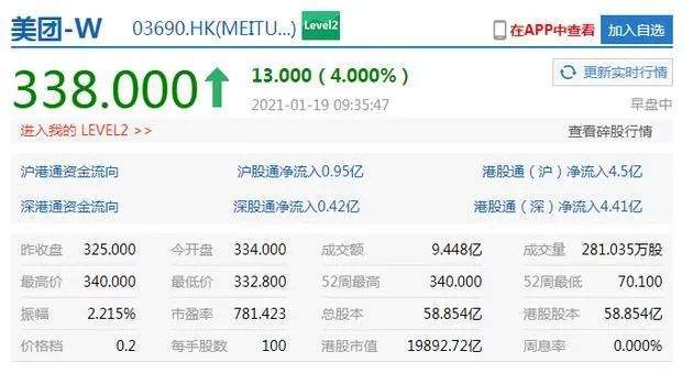 与此同时,美团股价却连续创造历史新高。1月19日收盘,其股价报340港元,市值首次突破2万亿港元大关。