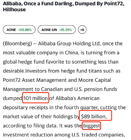据彭博数据,Point72 Asset Management、Moore Capital Management、加拿大及美国的养老基金,在去年四季度,抛售了1.01亿份阿里巴巴美国存托凭证,申报数据显示,他们减持的股票市值为890亿美元,约合5745亿人民币。
