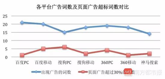 各平台广告词数及页面广告超标词数对比,可以看出百度PC广告词最多,搜狗PC页面广告超标最严重