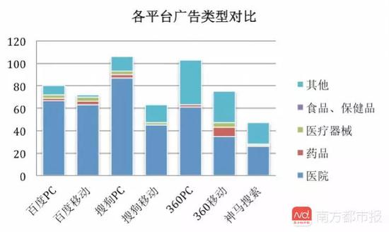 各平台广告类型对比,可看出在百度和搜狗推送的付费广告中,医院广告占绝大多数