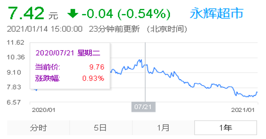 或受此影响永辉超市股价震荡不断,永辉超市目前股价7.33元,相比股价高点11.07元跌幅在30%左右,目前总市值为697.54亿元,相比高点时的近千亿市值已大幅缩水。