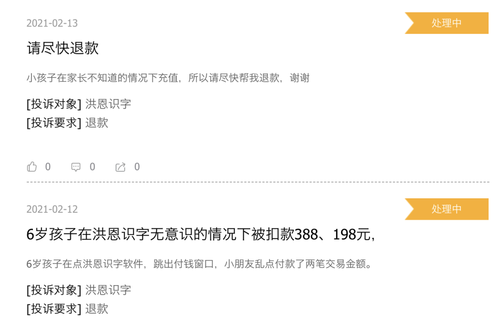 有用户投诉称,“洪恩识字缺少退款服务,买错了学习阶段,想退款却无人搭理”。同时,另有消费者投诉称,在要求退款时客服表示是虚拟产品不可以退款。此外,很多消费者表示因孩子误操作而重复支付,希望退费;但多次联系人工客服却无人接听。而洪恩识字在用户不知情的情况下自动扣费,也是消费者投诉的主要原因。