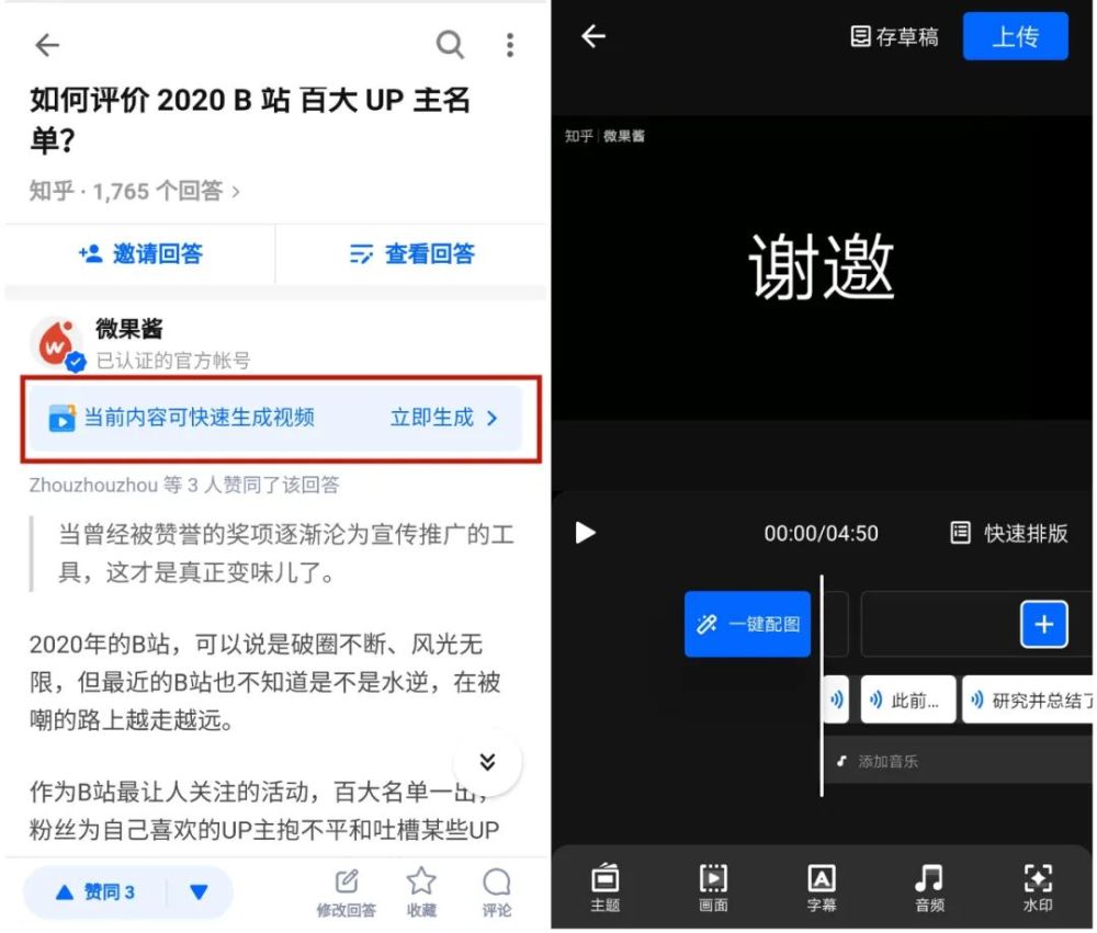 此外,去年10月份知乎也推出了图文一键生成视频的功能,不过目前手机端仅支持【回答】专栏下内容一键生成视频,【文章】内容生成视频需要在PC端登录账号。同样是一键傻瓜式操作,视频小白完全可以轻松驾驭。