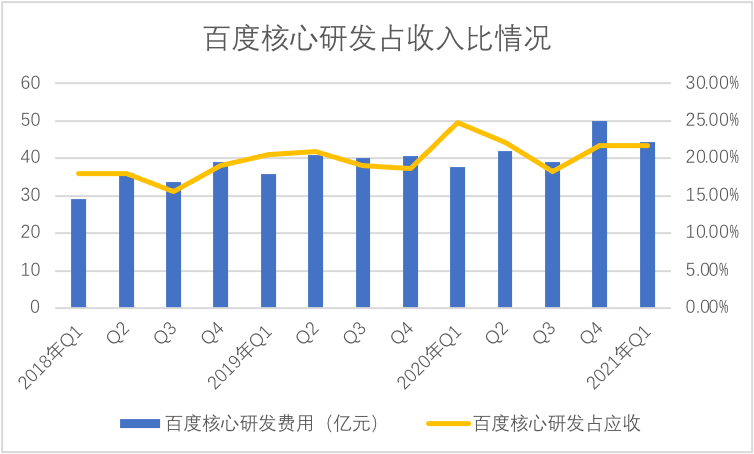 在过去三年时间里,百度一方面在主营业务端进行着高成本的改造,如对内容创作者的补贴市场费用的膨胀,而另一方面,也仍然保持着研发费用的大比例支出,到2021年Q1百度核心研发占收入比已经连续两个季度超过20%大关。