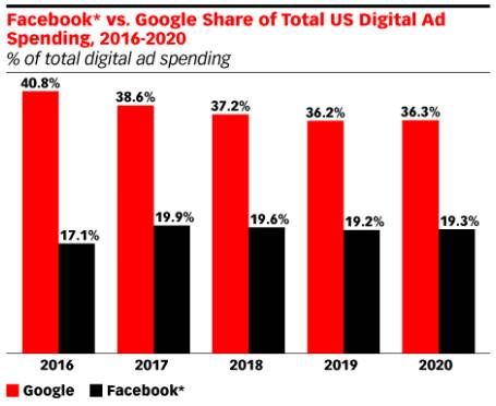 亚马逊进入广告业务相对较晚,谷歌和Facebook是毫无疑问的数字广告“双巨头”。 据市场调查公司eMarketer数据,两家公司目前在美国数字广告份额的占比达到58.5%,遥遥领先于其他公司。