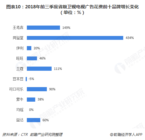 省级卫视方面,广告花费前十品牌与整体也有一定差别,多了王老吉、豆本豆、蒙牛、均瑶及益达五个品牌。其中,同溢堂在省级卫视广告花费增长最快,达到434%,大幅领先其他品牌;王老吉、兰蔻广告花费增幅也在100%以上。