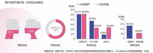 当社会消费力主流人群逐渐向年轻化迁移时,85后、90后、95后人群的兴趣特点逐渐备受关注,从2018年初抖音成为深受年轻人喜爱的短视频平台后,人群也发生了变化,从年轻化到多元化增长。2018年6月抖音发布的《抖音企业蓝V白皮书》显示,女性用户占比60%,30岁以下占比52.9%、30-40岁女性占比23.5%。