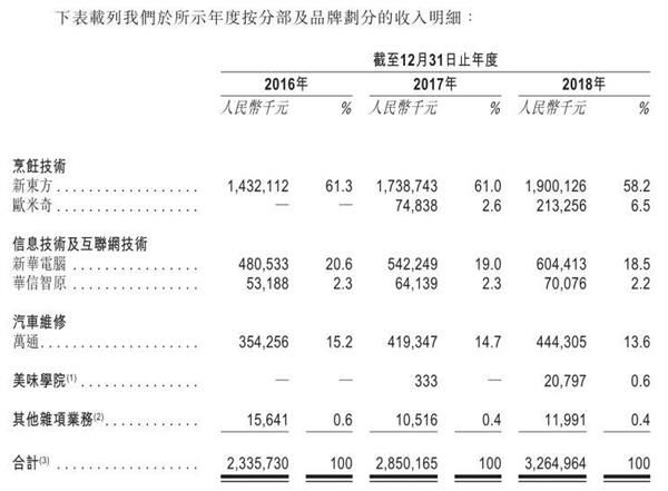 2016年至2018年,中国东方教育实现营收分别为23.36亿元、28.5亿元及32.65亿元,净利润分别为5.65亿元、6.42亿元、5.10亿元。根据招股书显示,新东方烹饪教育为东方教育贡献了超过一半的营业收入,新东方烹饪教育2016至2018年营业收入占比分别为61.3%、61%、58.2%。