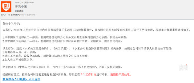 对于上述两位员工,小米已经对两人辞退,且永不录用,退还不当得利,没收全部期权,移送公安机关处理;加入员工不诚信黑名单。其中,赵芊已因涉嫌非国家人员受贿罪,被公安机关拘捕。