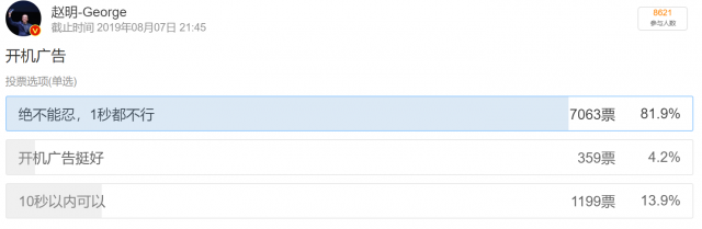 日前,赵明发布了一则微博,并针对网友关于开机广告的态度发起了调查。根据目前的调查结果来看(截稿前),针对开机广告这事,有81.9%的网友表示“1秒都不不能忍”,13.9%的网友认为“10秒以内可以”,仅4.2%的网友觉得“开机广告挺好”。