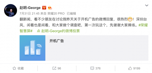 7月31日晚,荣耀总裁赵明针对网友关于开机广告的态度发起了微博调查,据调查结果显示,超过八成网友对开机广告持“零容忍”态度。