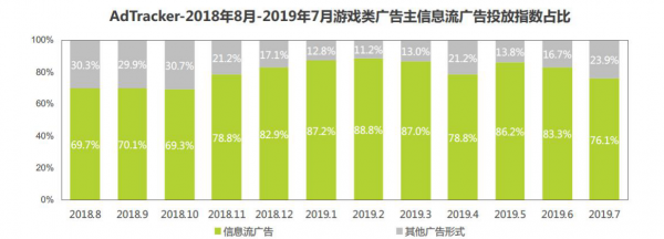 报告显示,自2018年8月起,信息流广告在游戏类广告主投放行为中的占比由69.7%逐渐升至88.8%(2019年2月),兼具原生性与精准触达特点的信息流广告已然成为了游戏广告厂商的首选。