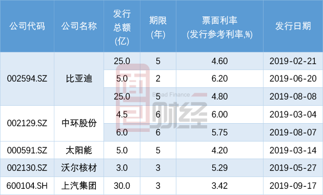 利率下行,企业发债热情升温。年内新能源行业及汽车行业已有多家公司发行债券,以下为今年以来部分具有代表性的公司债券: