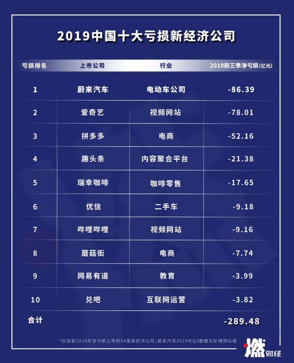 根据燃财经统计,2019年上半年,亏损最多的25家中概公司合计亏掉近200亿元。如果再算上今年第三季度,排名前10的亏损大户总计亏了289亿元。