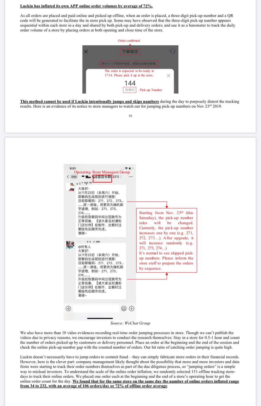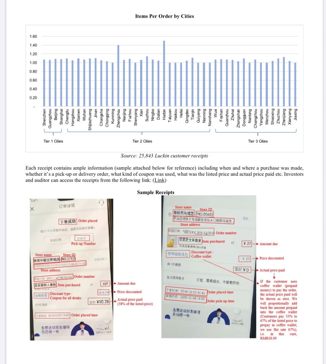 这份89页的匿名报告称瑞幸咖啡正在捏造公司财务和运营数据,撰写这份报告之人,派了92个全职和1400个兼职调查员,还收了25000多张小票 ,进行录了10000个小时的门店录像,认为瑞幸的平均每店货物数据在2019年第三季度虚增69%,在2019年第四季度虚增88%,并且收集了大量内部微信聊天记录,关联人与企业的工商信息,作证分析环环相扣。