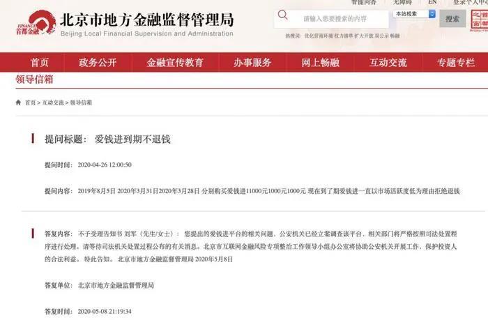 不过,中新网记者从北京市地方金融监督管理局网站上看到,针对有投资者提出爱钱进到期不退钱的问题,5月8日,北京市地方金融监督管理局在相关问题的答复中表示:公安机关已经立案调查该平台,相关部门将严格按照司法处置程序进行处理。