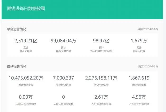 作为一家元老级P2P企业,爱钱进于2014年5月6日上线。官网显示,截至2020年7月2日,平台已累计服务用户1679万,累计为用户赚取出借回报98.97亿元,累计撮合交易2319.21亿元。