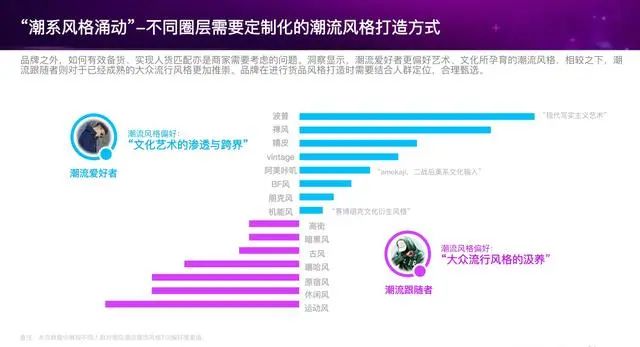 聚焦到品牌层,"潮流爱好者"更偏好日潮、欧潮等舶来文化的衍生潮流。相对地,国潮品牌则在"潮流跟随者"中存在更大的机会。如波普风、嬉皮风、复古风,"潮流爱好者"更偏好艺术、文化所孕育的潮流风格,相较之下"潮流跟随者"则对于像运动休闲、原宿风、嘻哈风等已经成熟的大众流行风格更加推崇。