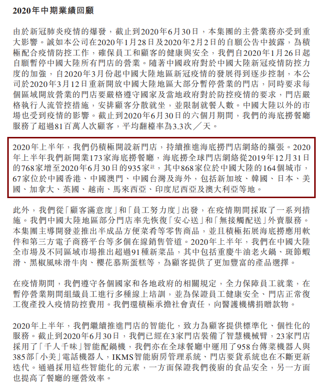 另一方面,即便主营业务受到重大影响,海底捞仍未停下扩张步伐。海底捞称,上半年,公司仍积极开设新门店,持续推进海底捞门店网络的扩张。上半年新开业173家海底捞餐厅,海底捞全球门店网络从2019年12月31日的768家增至2020年6月30日的935家。