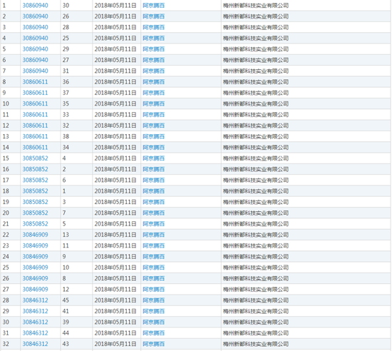其名下共有53件商标,其中45件为“阿京腾百”商标,于2018年5月11日集中申请,涉及餐饮、饲料、床单、食品、军火烟火、医疗器械、厨房洁具等等。