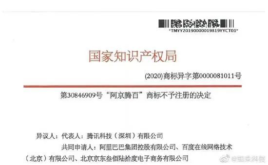 2018年,一家公司向商标局提交申请了“阿京腾百”商标,腾讯、百度、阿里、京东四家公司联合申诉提出异议。