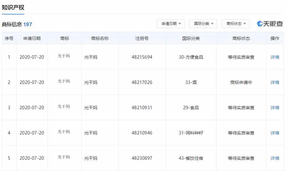 近日,贵阳南明老干妈风味食品有限责任公司新增商标信息,商标名称为光干妈,国际分类为餐饮住宿,申请日期为2020年7月20日,商标状态为“等待实质审查”。