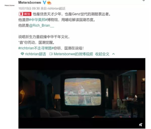 日前,美特斯邦威(简称美邦)推出博物馆系列,并官宣说唱歌手Rich Brain成为中华美邦系列的代言人。美邦表示:“将中国传统文化与说唱艺术结合,为当下年轻人带来不一样的国潮体验。”