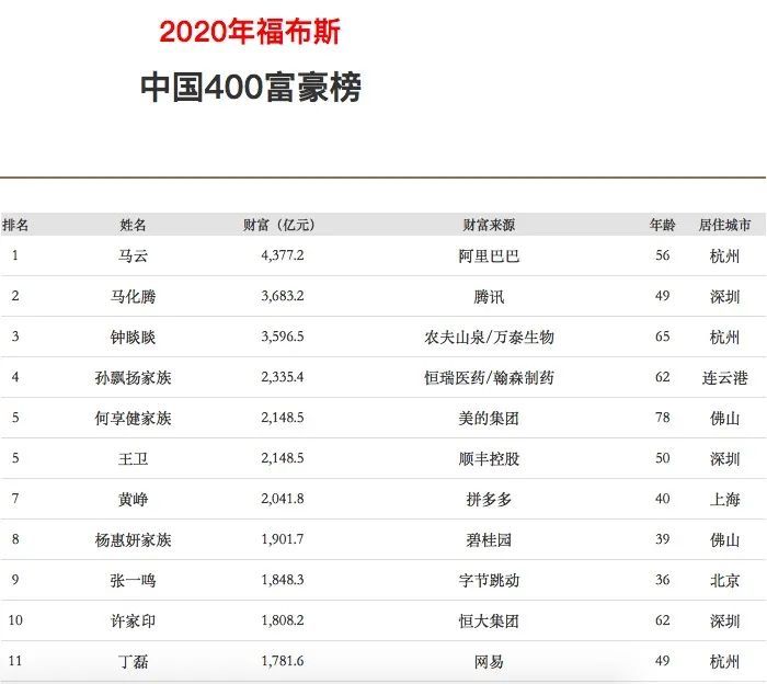 福布斯表示,本榜单计算财富值使用的是10月26日的收盘价和人民币对美元汇率中间价,这个时点是在11月3日蚂蚁集团由于监管原因暂缓沪港两地上市之前。连同马云在内,总计有10位蚂蚁集团个人股东入选今年的中国富豪榜。