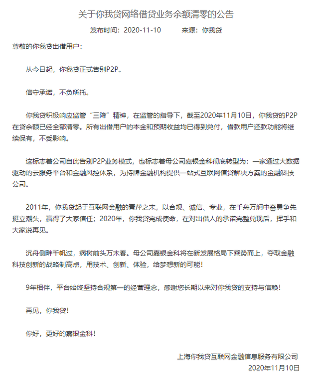 在市场还在猜测到底还有哪三家在营P2P的时候,11月10日,老牌P2P机构“你我贷”宣布,已完成所有网络借贷存量业务的化解工作,目前在贷余额已经全部清零,所有出借用户的本金和预期收益均已得到兑付,正式退出P2P。