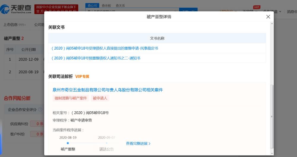 据天眼查APP在8月19日贵人鸟破产重整案关联文书中公布的“受理债权人直接提出的重整申请-民事裁定书”显示,2020年8月12日,泉州市奇皇星五金制品有限公司以贵人鸟不能清偿到期债务并且明显缺乏清偿能力为由,向福建省泉州市中级人民法院申请对贵人鸟股份进行重整。并裁定受理泉州市奇皇星五金制品有限公司对贵人鸟股份有限公司提出的重整申请。
