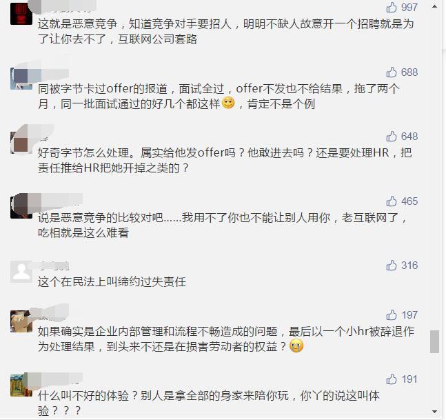 与此同时,@天城犬犬的这条微博引起广泛关注,目前转发已超过2万,引起热议。结合网友评论情况来看,@天城犬犬的遭遇并不是个例,有网友评论:“同被字节卡过offer的报道,面试全过,offer不发也不给结果,拖了两个月,同一批面试通过的好几个都这样,肯定不是个例”、“同感。我七月底通过终面,但迟迟不发offer,等了半个月多次追问,hr才说可能由于沟通有问题导致没有及时回复~就凭hr这态度,感觉公司价值观有问题。果断放弃,完全不后悔。”