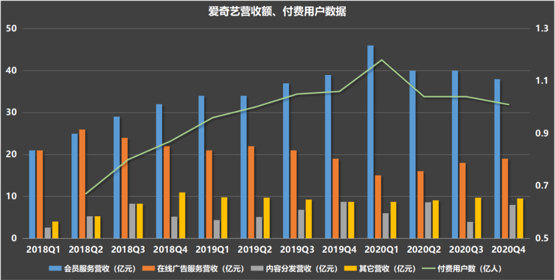2018年上市之初,爱奇艺的营收结构一度是相对健康的会员付费+在线广告双支柱结构。甚至二季度广告营收一度超越会员营收。而从2020年营收情况看,会员营收与广告营收六二开的结构基本固化下来。