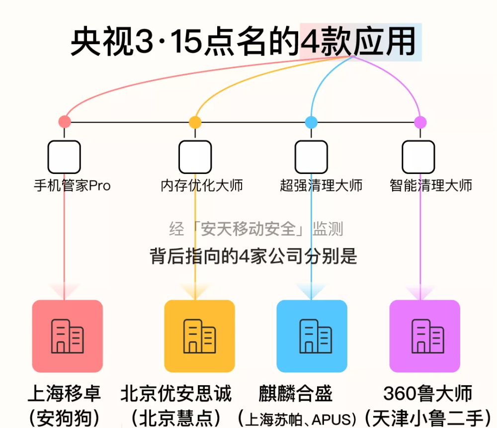 央视3·15点名的4款应用是手机管家Pro、内存优化大师、超强清理大师、智能清理大师,经安天移动安全监测,背后指向的4家公司分别是上海移卓(安狗狗)、北京优安思诚(北京慧点)、麒麟合盛(上海苏帕、APUS)和360鲁大师(天津小鲁二手)。