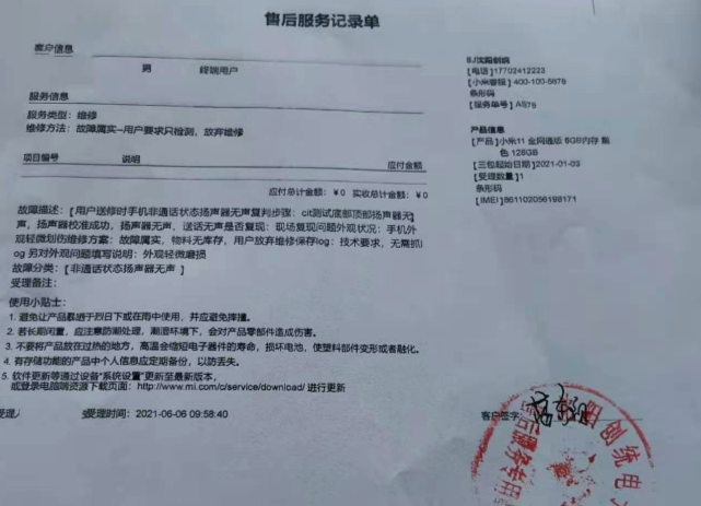一位沈阳小米用户展示的售后服务记录单显示,其三包起始日期为2021年1月3日的小米11首发全网通版产品发生非通话状态下扬声器无声,经检测发现,产品cit测试底部与顶部扬声器无声,故障属实。该用户表示,参考目前市场上出现的大批量小米11质量问题,其个人猜测可能是某种设计缺陷所导致,但由于个人工作繁忙、没有太多时间耗费,最终选择退货来规避类似风险问题再次发生。