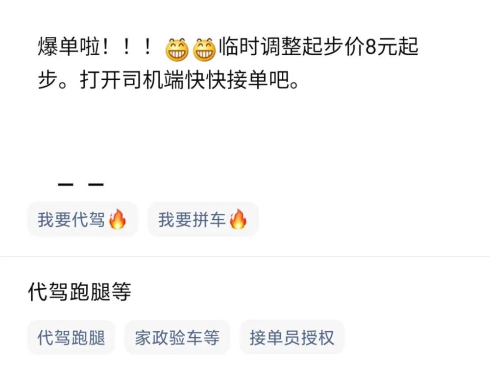 同时,相较于微信群,公众号约车不仅快而且提供的服务还多。除了单纯的叫车,你还可以叫代驾、跑腿儿等等。在我们县城,至少我身边的朋友们在约车的时候第一选择都会是这个平台。真的很火,火到我记得在上个月月中,这个公众号还发布文章称,因为爆单,临时调整了起步价8元起步,让大家打开司机端快快接单。