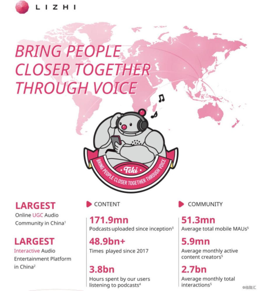 荔枝致力于做为主播付费的事,拥有海量的音频内容创作者和海量的用户原创播客内容。最新招股书显示,荔枝拥有约590万月均活跃内容创作者,超过月均活跃用户总数的11.4%,用户平均月度互动次数约27亿次。截至2019年11月30日,平台已积累了超过1.7亿音频内容。