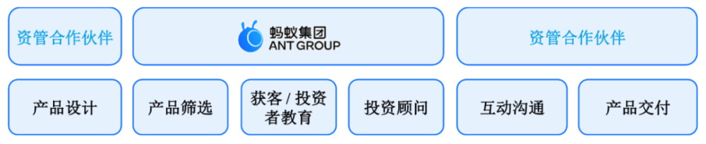在整个理财产品体系中,蚂蚁集团主要作为资管合作伙伴的“助力者”角色,主要负责理财产品筛选、投资者管理以及提供智能投顾服务。而资产管理合作伙伴则负责产品设计、交付以及同蚂蚁集团平台投资者互动沟通。