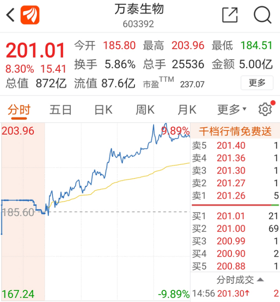 此外,钟睒睒还持有上市公司万泰生物74.23%股权。截至9月23日收盘,万泰生物收涨8.3%,总市值为872亿元。