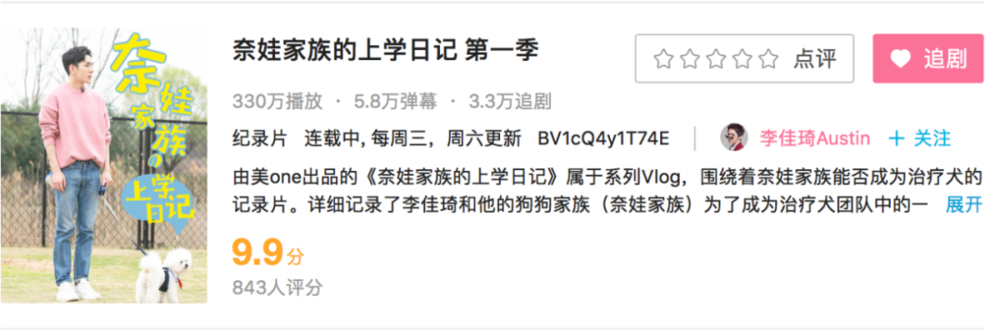 今年4月22日,美ONE拍摄、李佳琦和Never参与公益项目的vlog《奈娃家族的上学日记 第一季》正式播出,微博播放量超过5000万,相关话题#李佳琦送never去当治愈犬#冲上了微博热搜第一。这档节目在B站播放量累计也有330万,追剧人数突破3万。