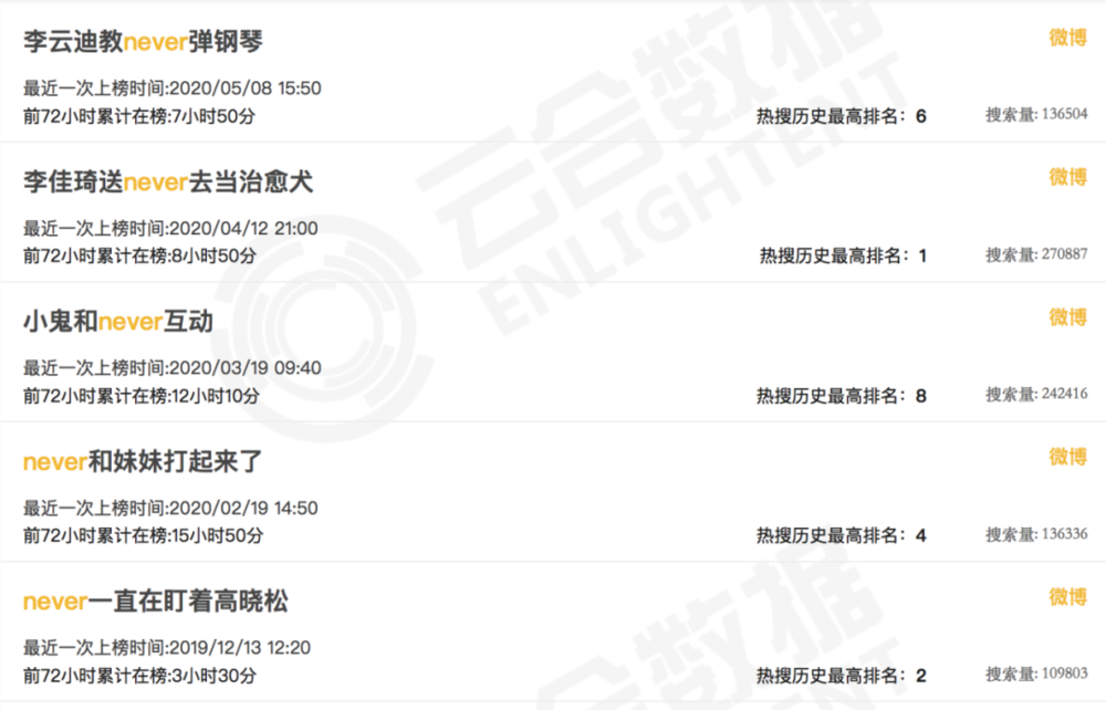 今年上半年,never频繁冲上热搜,其中一些话题是萌宠与明星的互动,比如#李云迪教never弹钢琴#,另一些甚至只是never家族的内部“战争”,比如#never和妹妹(另一只狗)打起来了#。