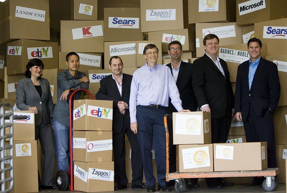 图3:2008年,谢家华(左二)与当时Barnes&Noble、GroupM、eBay等公司的高管和微软联合创始人比尔·盖茨在一起。