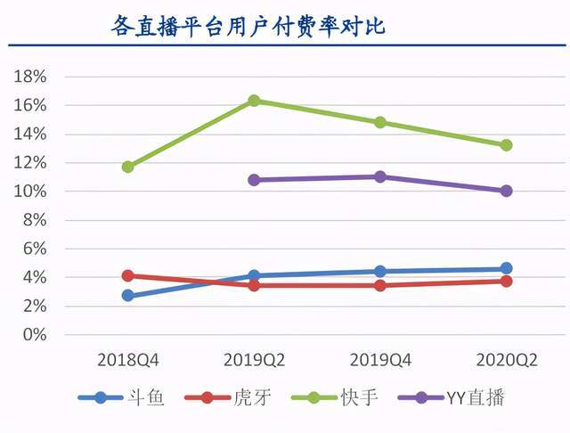 直播行业目前的主要玩家包括抖音、快手、斗鱼、虎牙、YY等。在短视频红利下,快手和抖音御风而行,增长迅猛。快手在 2018年直播收入超越 YY直播,之后一路扩大领先优势,成为第一大网红直播打赏平台。付费率角度,游戏直播斗鱼和虎牙的付费率约在 3%-5%之间,二者不相上下;YY直播付费率在近几季度保持 10%左右,快手的直播用户付费率相对更高,2019年 Q2达到 16.3%的峰值,之后略有回落。