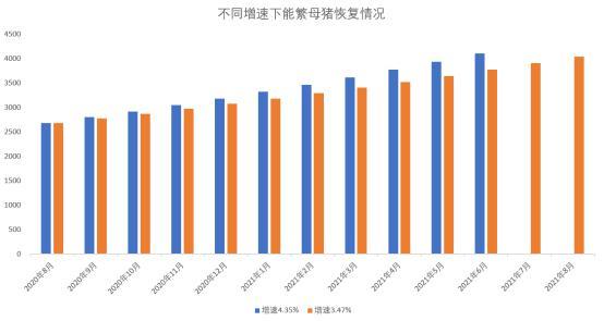 2020年8月,我国有能繁母猪2685万头,自2020年以来能繁母猪以3.47%和4.35%环比增长的速度逐步恢复。以这两个数据测算,要达到3900万头能繁母猪平衡点大约在2021年5月-7月。