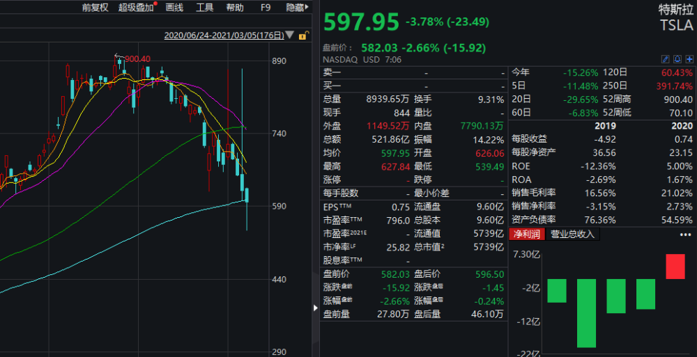 不过,自2月8日马斯克对外披露投资15亿美元购入比特币的消息后,特斯拉股价就一路下挫,截至目前跌去了30%,市值缩水超2500亿美元,最新市值为5739亿美元。2020年,特斯拉股价涨幅惊人,年内增长超过743%。