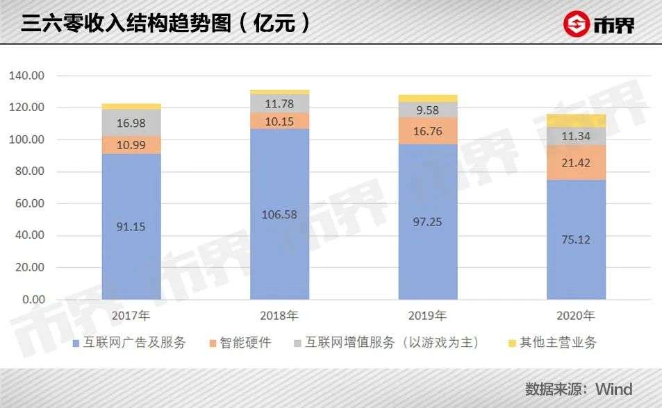 2019年,三六零的收入开始下滑,从上一年的131.29亿元降至128.41亿元,2020年再次下滑至116.15亿元。其中,广告业务波动最大,两年时间下滑了29.52%。